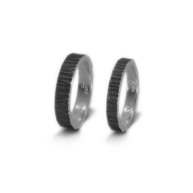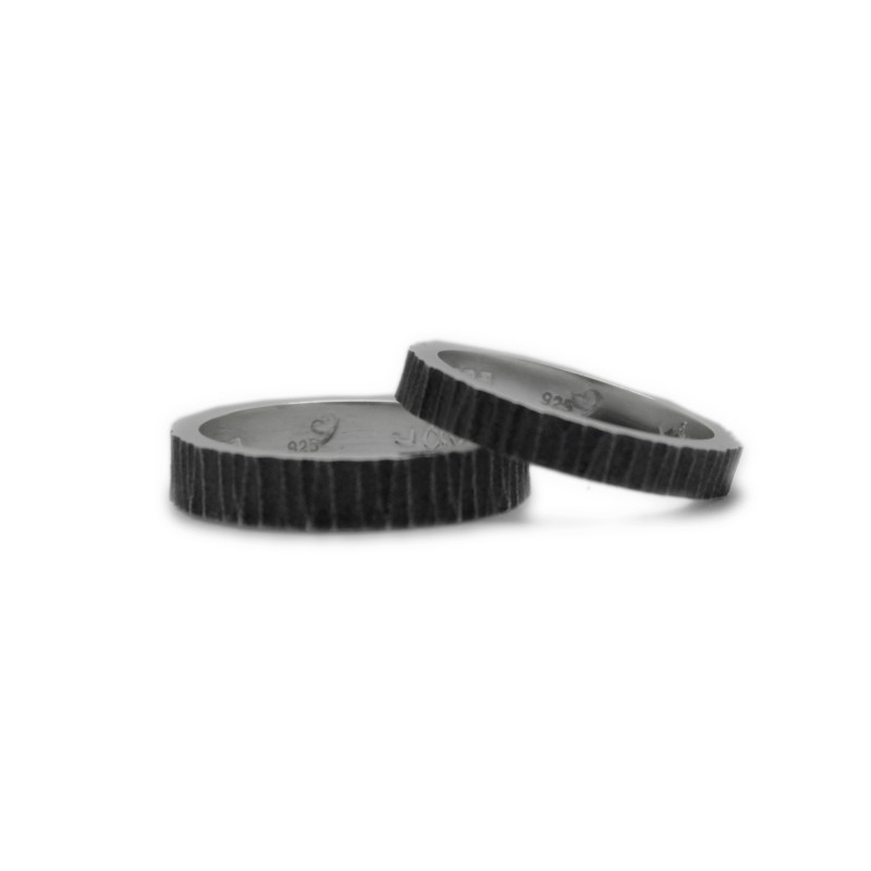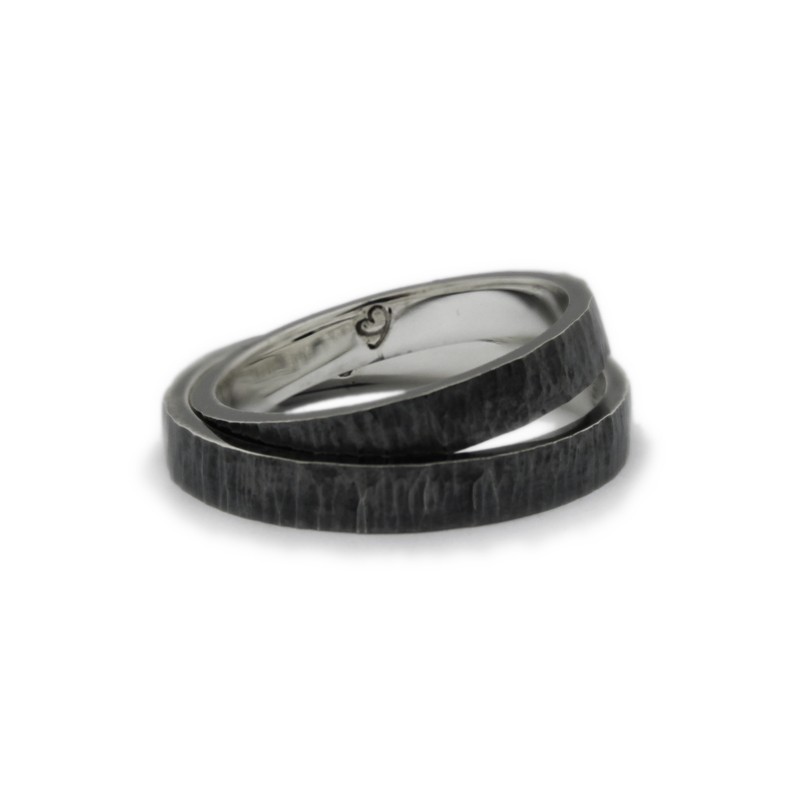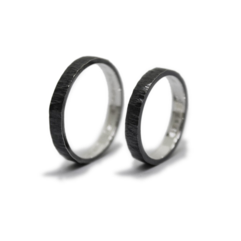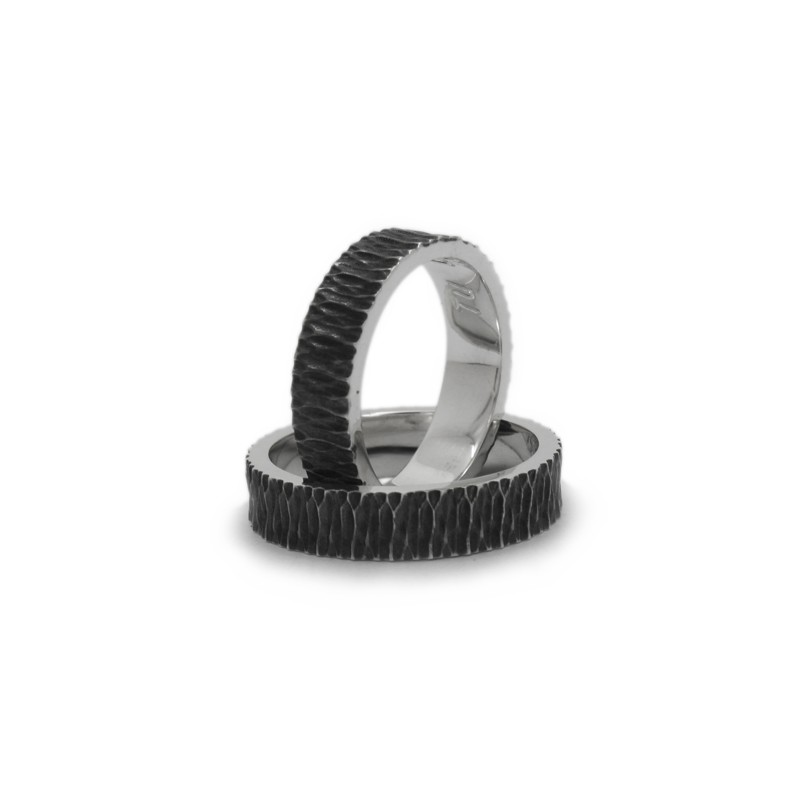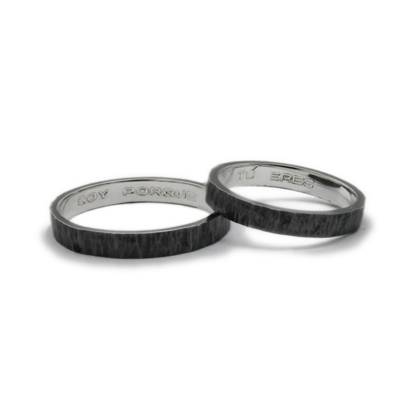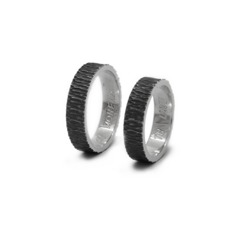 Un clàssic dels que mai no passen de moda: aliances personalitzades en plata de llei envellida, també anomenada "plata enfosquida" o "plata negra", i amb inscripció personalitzada a l'interior. Acabat martelé exterior.