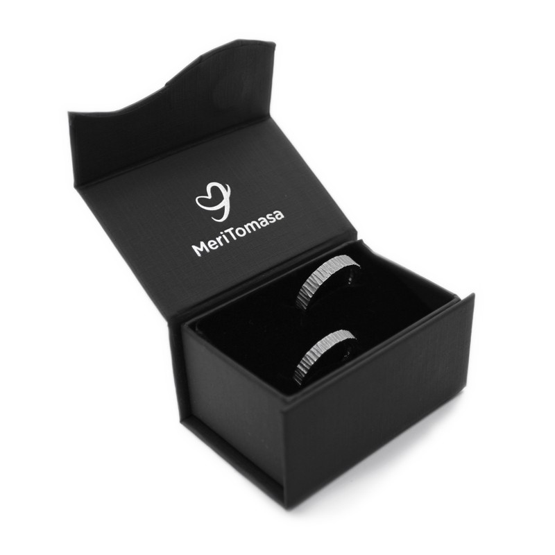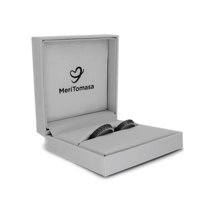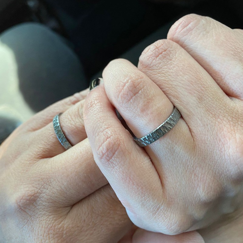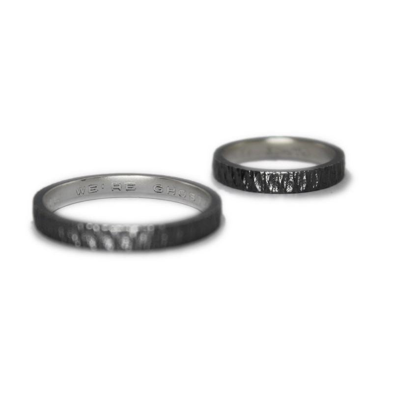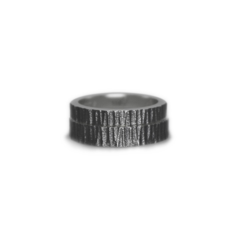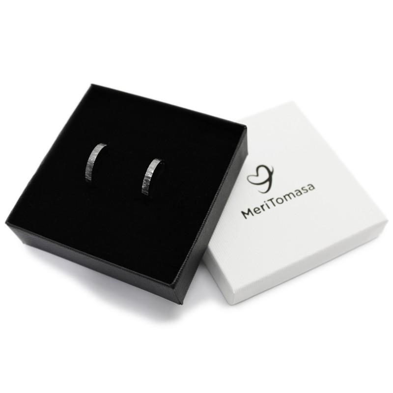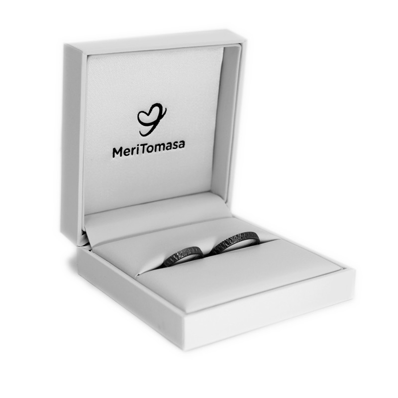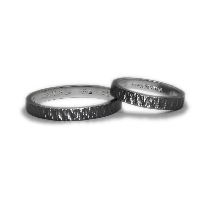 Un clàssic dels que mai no passen de moda: aliances personalitzades en plata de llei envellida, també anomenada "plata enfosquida" o "plata negra", i amb inscripció personalitzada a l'interior. Acabat martelé exterior.