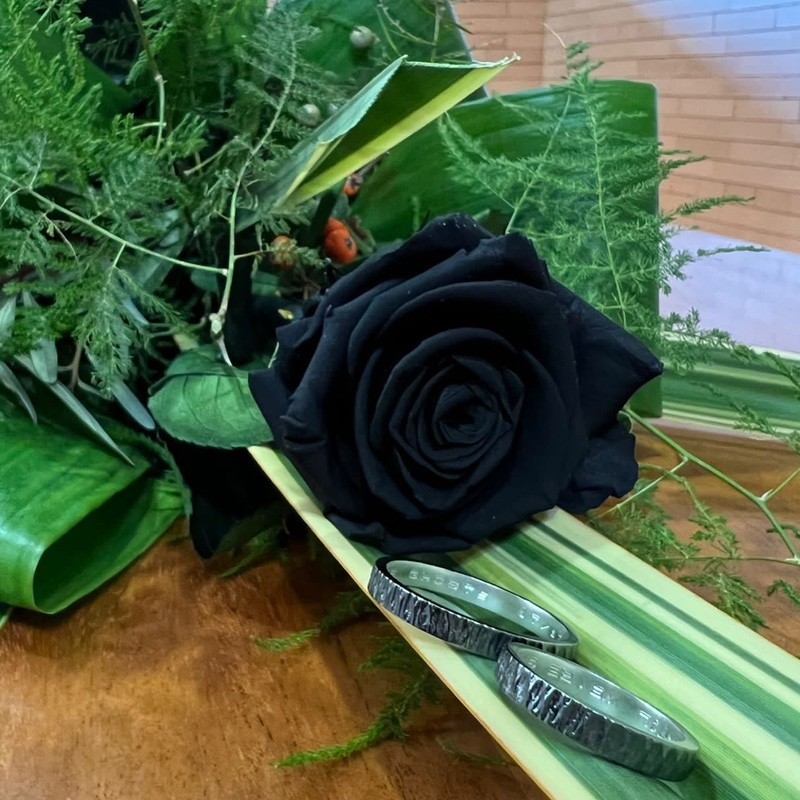 Volien unes aliances discretes, senzilletes i sense massa ornaments, o millor cap, i que dins portessin una inscripció personalitzada... Com es diu la pel·lícula? Aliances martelé en plata negra (de vegades també en plata polida :)