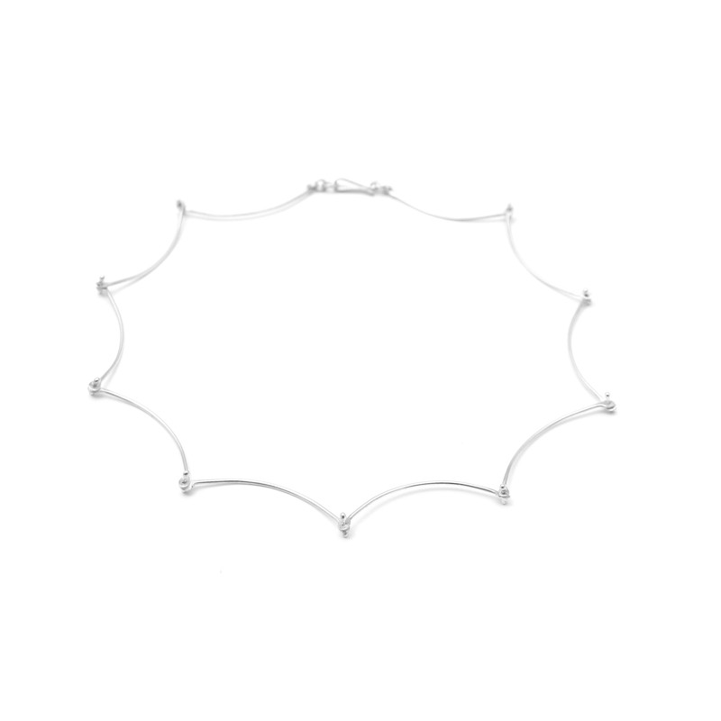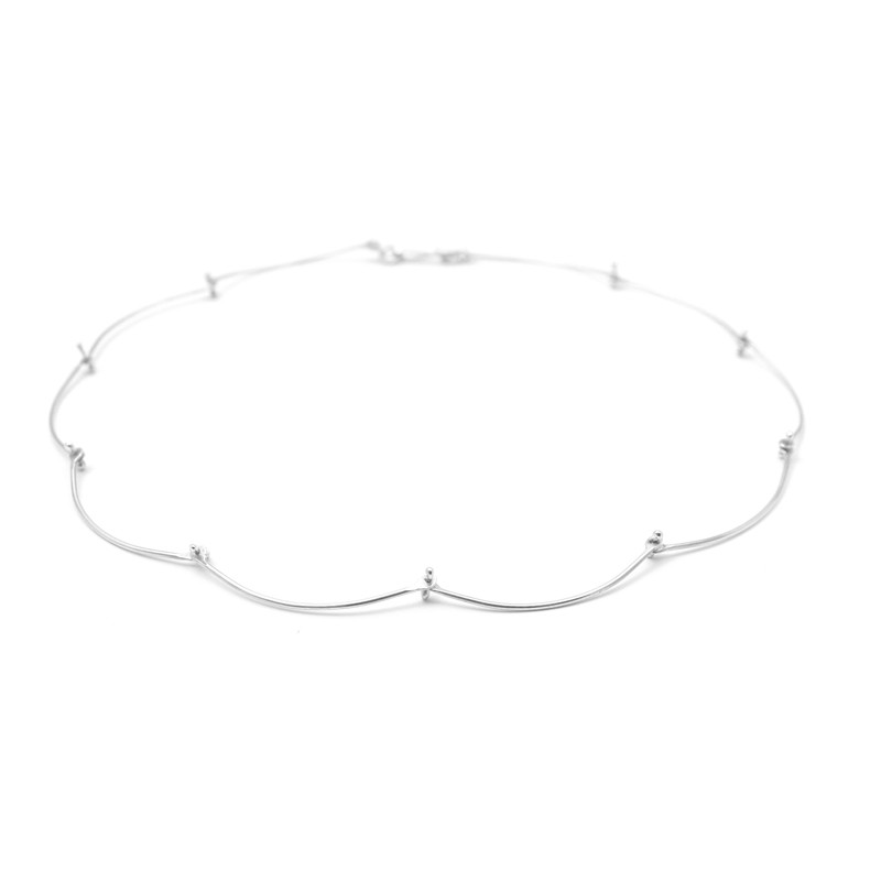 Aquesta és la cadena Ossets 002, fabricació totalment artesanal de la mà de MeriTomasa. Té dues posicions per ajustar-se al coll: puntes cap a dins o cap a fora. Longitud de 42 cm. Disponible en dos acabats, plata brillant o enfosquida.