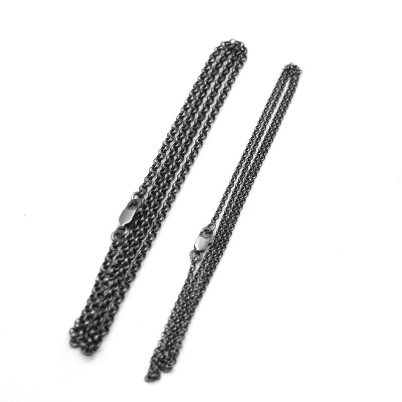 Aquesta és una cadena tipus rolo amb tanca de mosquetó, plata enforquida. La tinc disponible en dos gruixos, així com en diferents longituds: 40, 45, 50 o 60 cm.