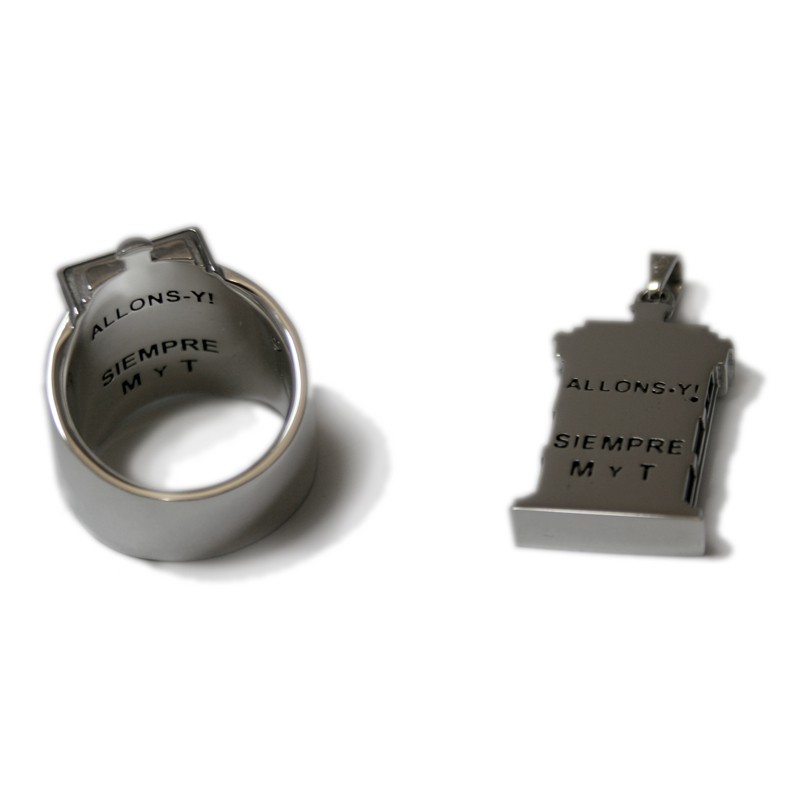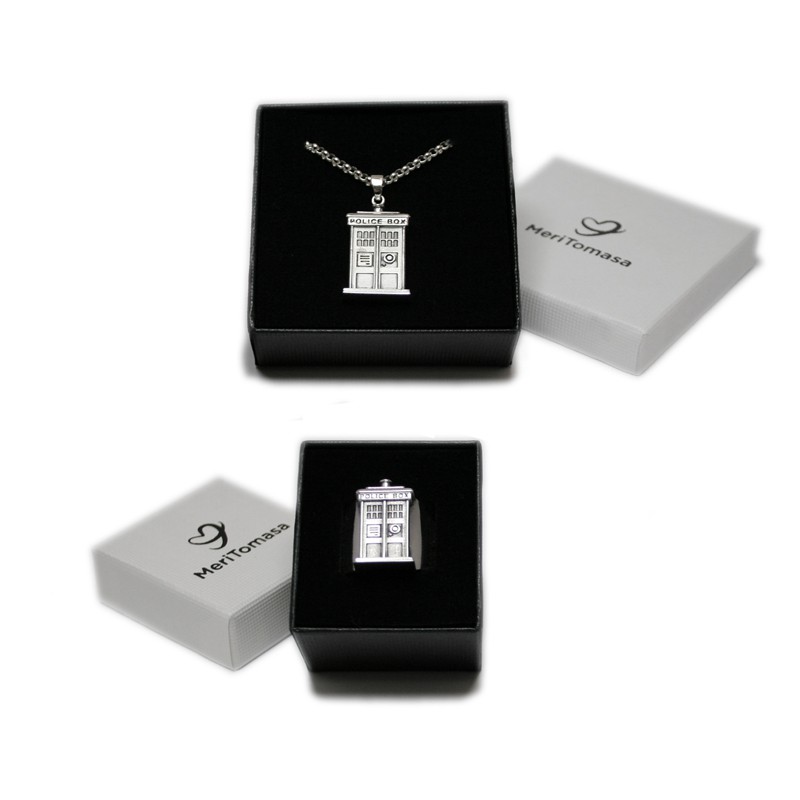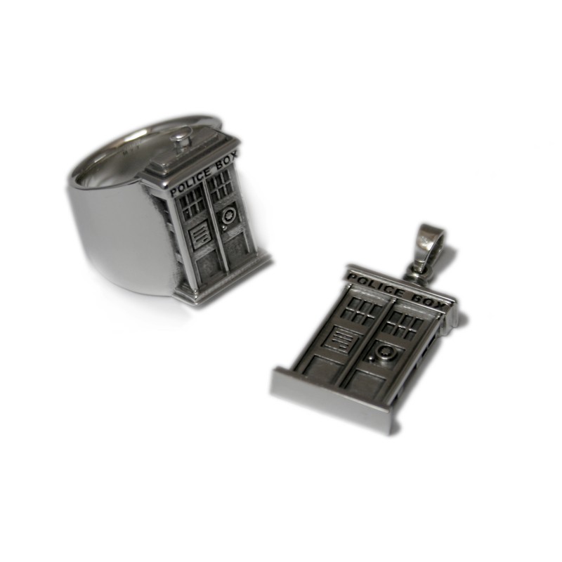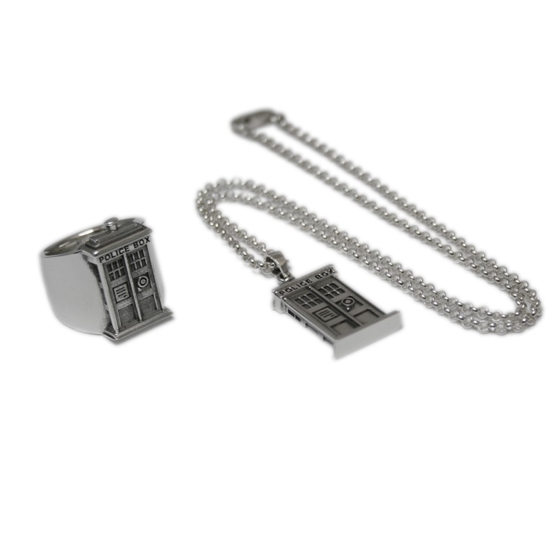 Conjunt personalitzat en plata de llei. Format per anell i collaret amb forma de TARDIS (acrònim en anglès de «Time and Relative Dimension in Space»), la nau espacial i màquina del temps de la sèrie britànica de ciència ficció Doctor Who.