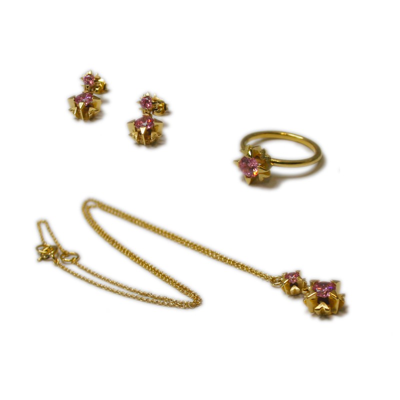 Conjunt personalitzat a partir de la Col·lecció Il·lusions: Collaret compost Uve, Anell Uve i Arracades compostes Uve, tots amb circonites roses.