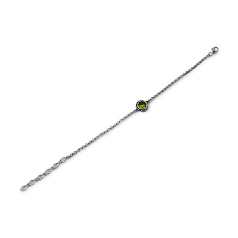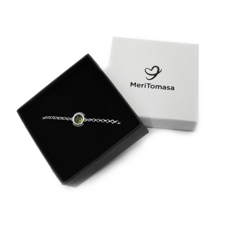 Polsera personalitzada en plata de llei i amb un peridot. Regal de l'Emma per la seva germana. Cadena de plata de llei acabada en baules més grans per fer-la ajustable. Al centre, un peridot.