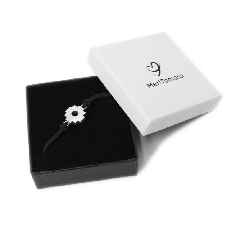 Polsera Xacana![]() | Plata de llei i cordó de niló negre | 74€ | Xacana petita (12mm alt x 12mm ample x 4,5mm gruix) combinada amb polsera de niló negra. |
