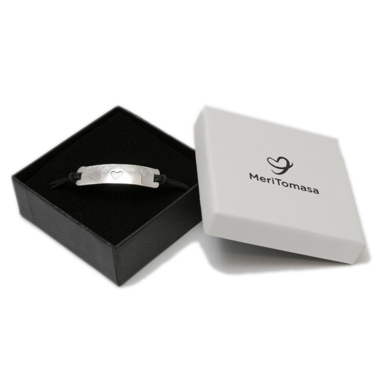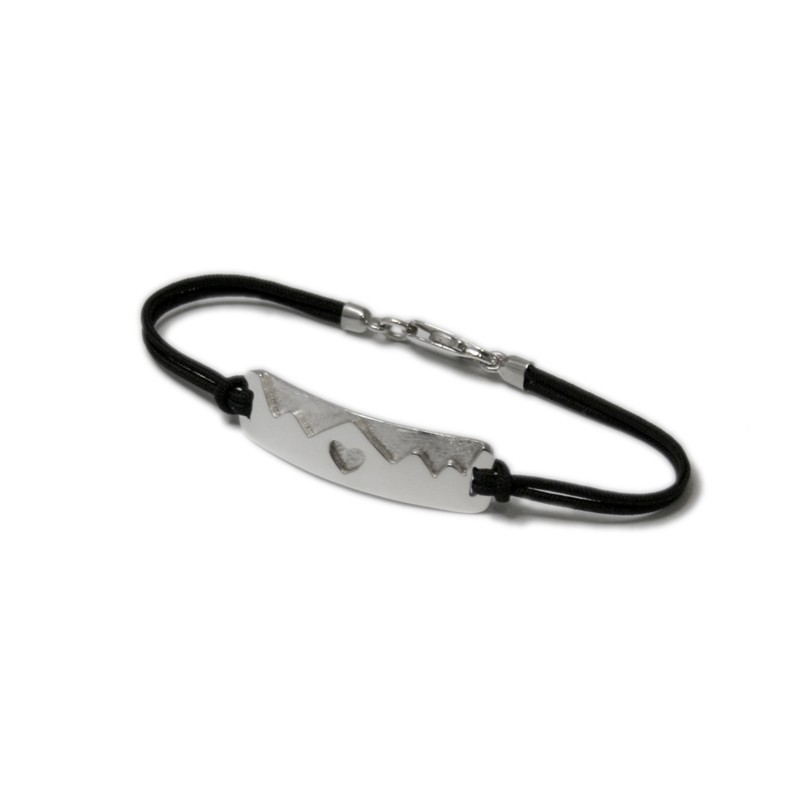 Bracelet with a plate with two heights: on one the polished and shiny mountain; behind her the sky, with a striped background. In the center, a heart. On the reverse, an inscription with a special date.