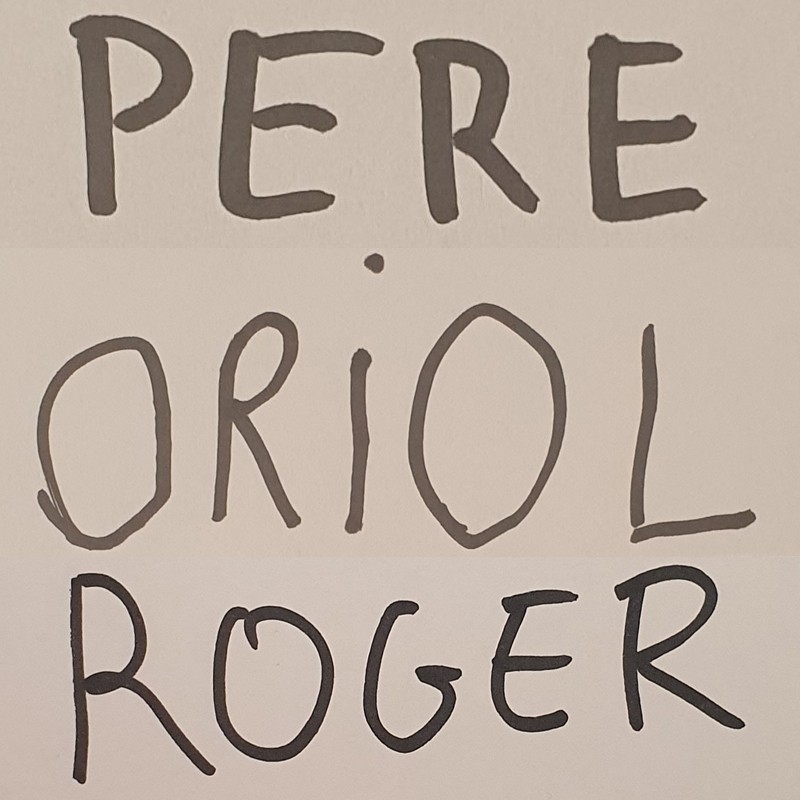 Two sterling silver personalized name bracelets, self-gift for Anna, Oriol's and Pere's mother, with the father's name, Roger, inside. All names, handwritten by Oriol, Pere and Roger. I have only turned them into precious metal :)