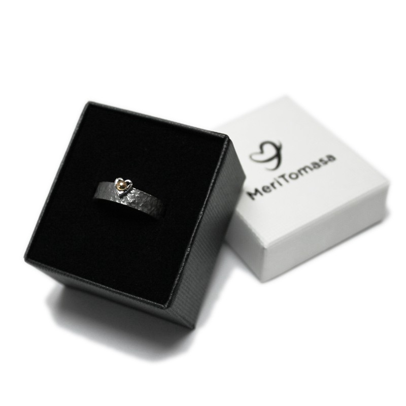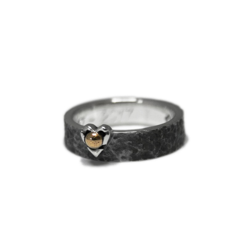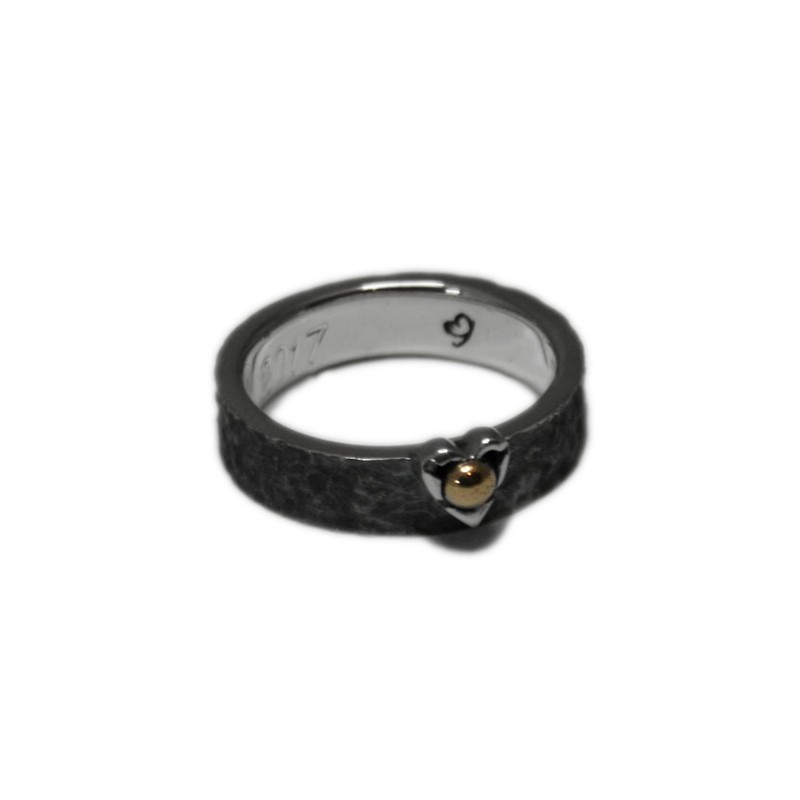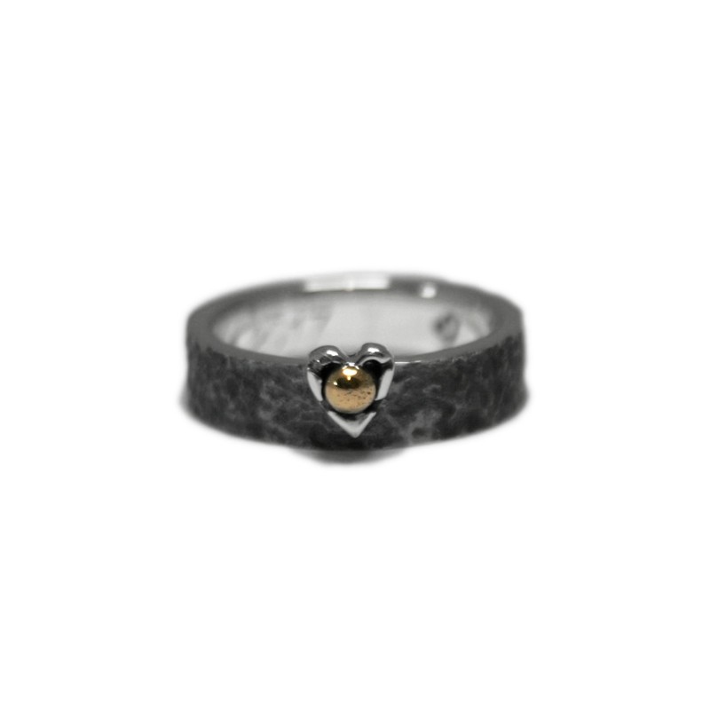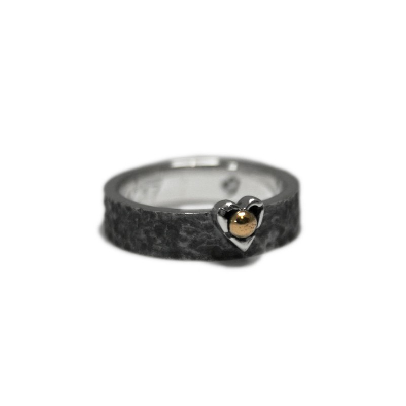 Sterling silver ring with a rough and darkened finish. In the central part, an off-center heart-shaped garrita. But instead of embracing a gemstone, the claw accommodates an 18K yellow gold bead.
