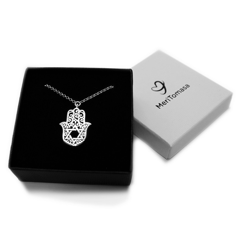 Hand of Fatima necklace, also known as Hamsa or Khamsa: a very popular protective amulet in Islam and Judaism, especially in the Middle East and North Africa. It is a symbol in the shape of a hand with outstretched fingers, often combined with other symbols included in the palm of your hand. Believers wear it against the evil eye, bad energies, and misfortune, to attract good luck and fortune, and generally as a talisman of protection and blessing.