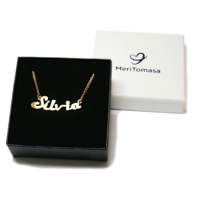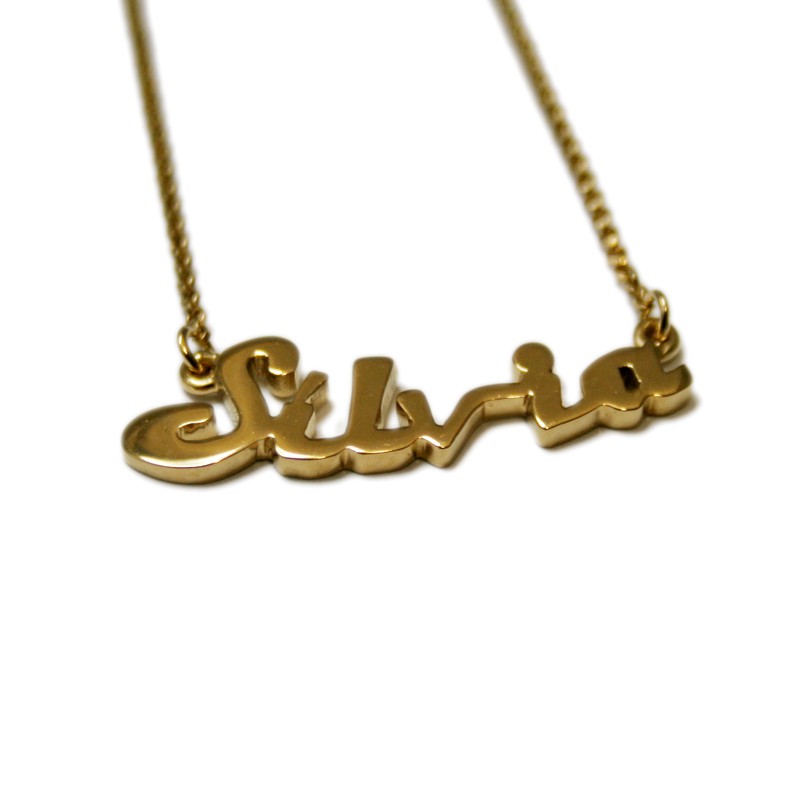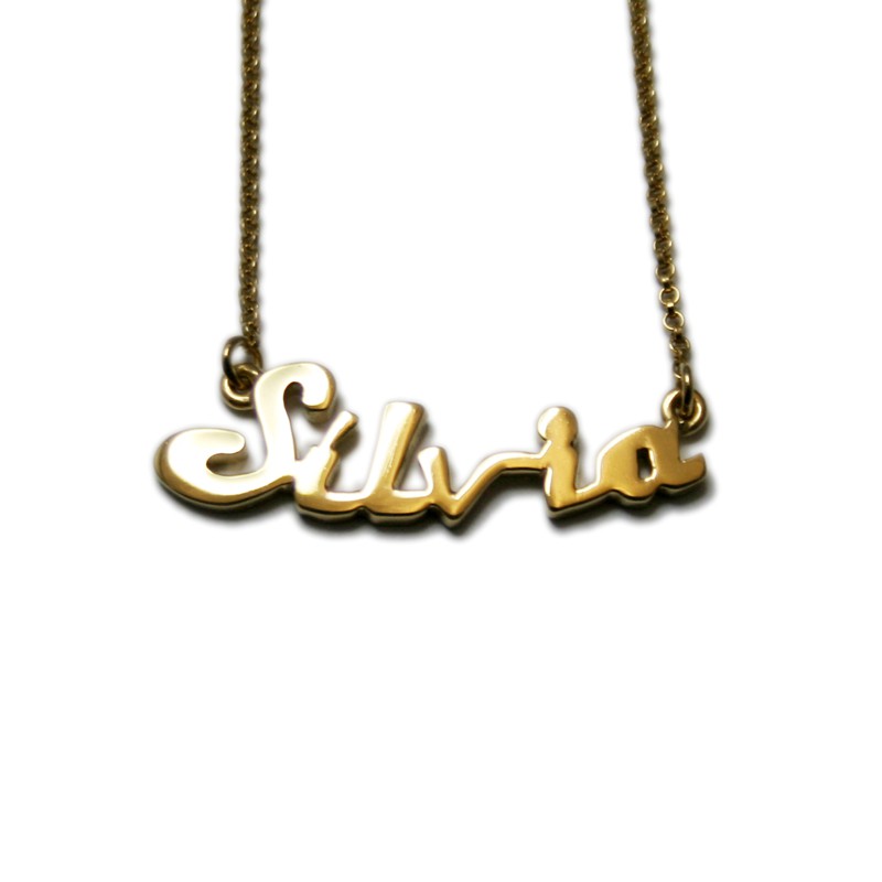 Personalized name necklace, Oscar's gift for Sílvia. 18kt yellow gold plated sterling silver.