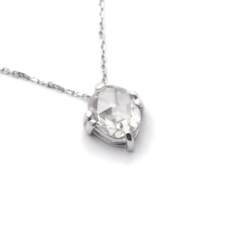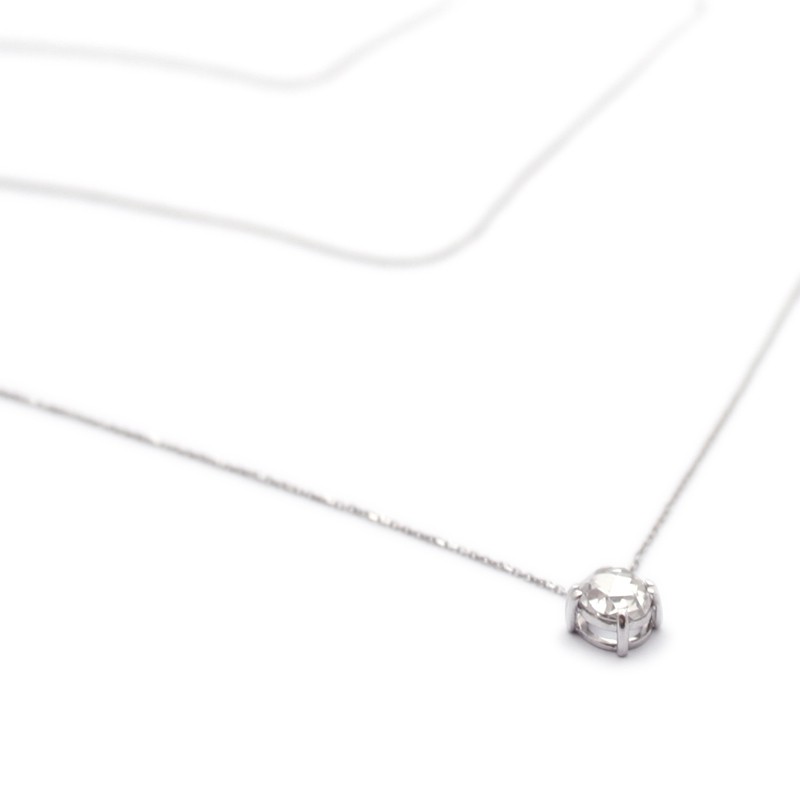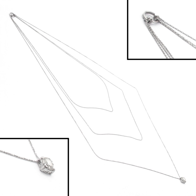 Diamante talla rosa engarzado en la mínima expresión de lo que es una montura. Tres cadenas independientes de diferentes longitudes (42, 50 y 60cm) para poder escoger cómo lo quiero llevar según la ocasión.