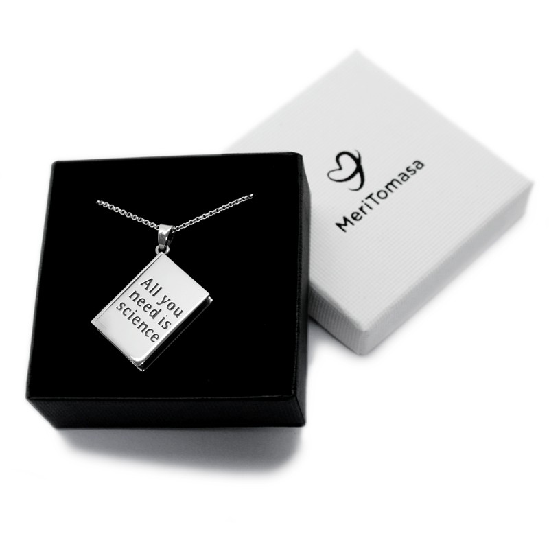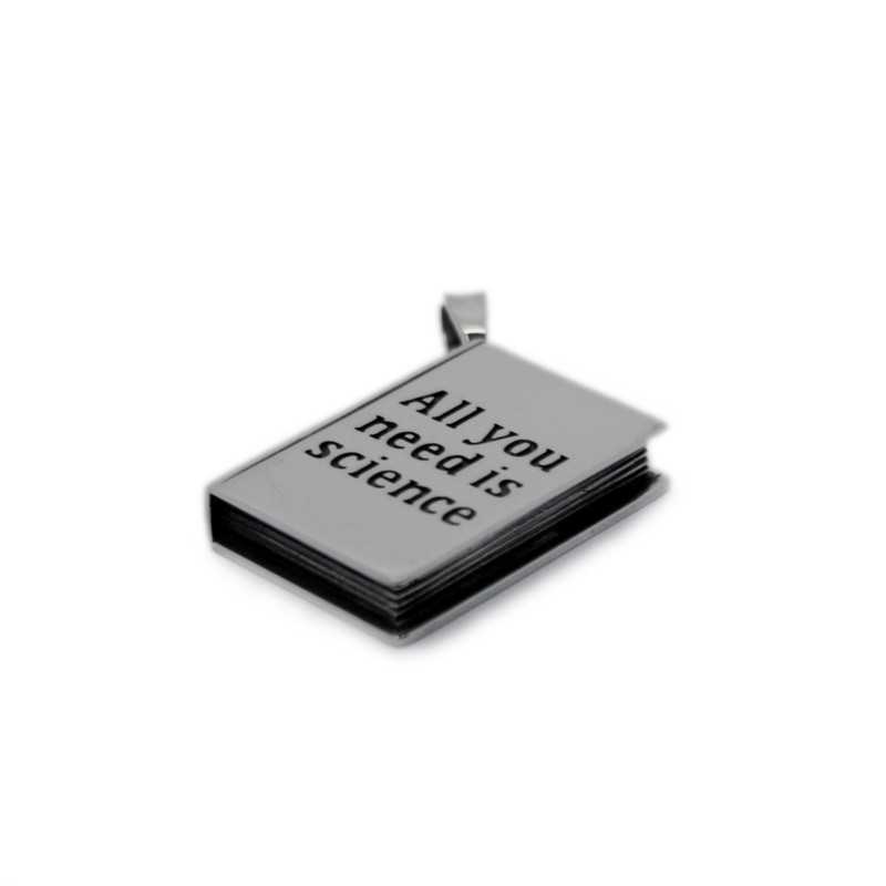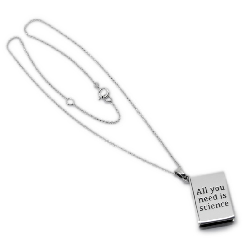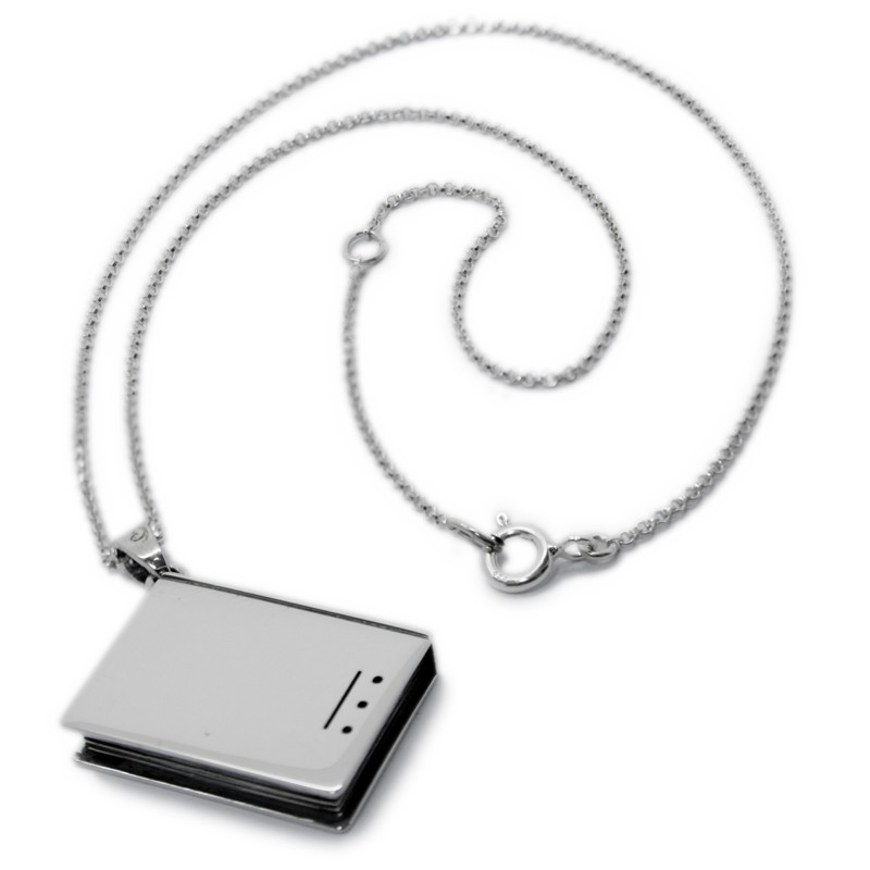 Plata de ley con acabado pulido y grabados oscurecidos. Por delante del pequeño libro viene el eslogan, por detrás el logo de la editorial. Cadena de bolitas a 45cm, con anilla a 42 para acortar. 100% artesanal y en plata de ley, cadena incluida.