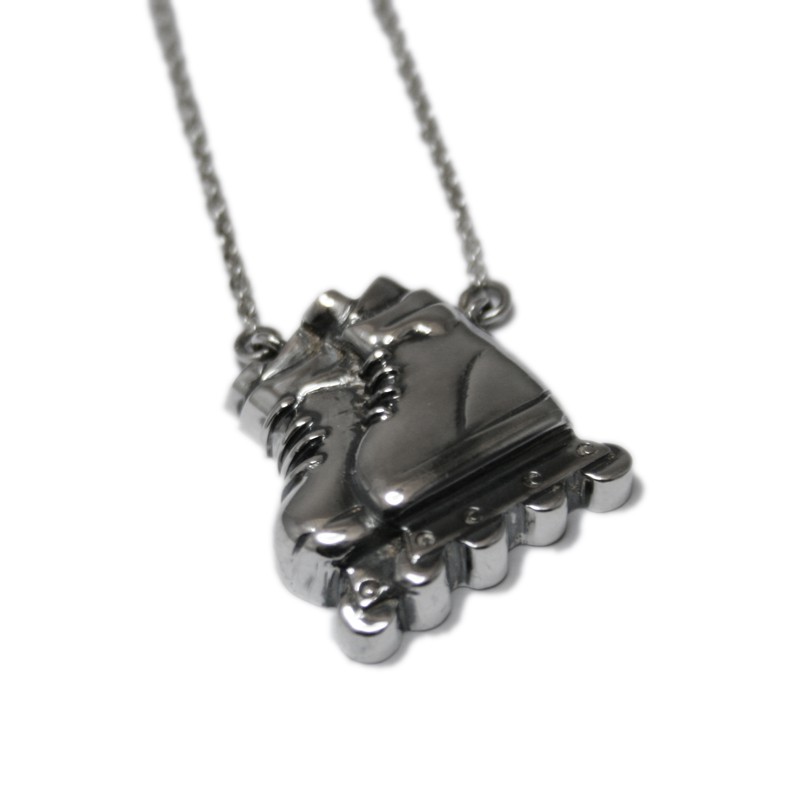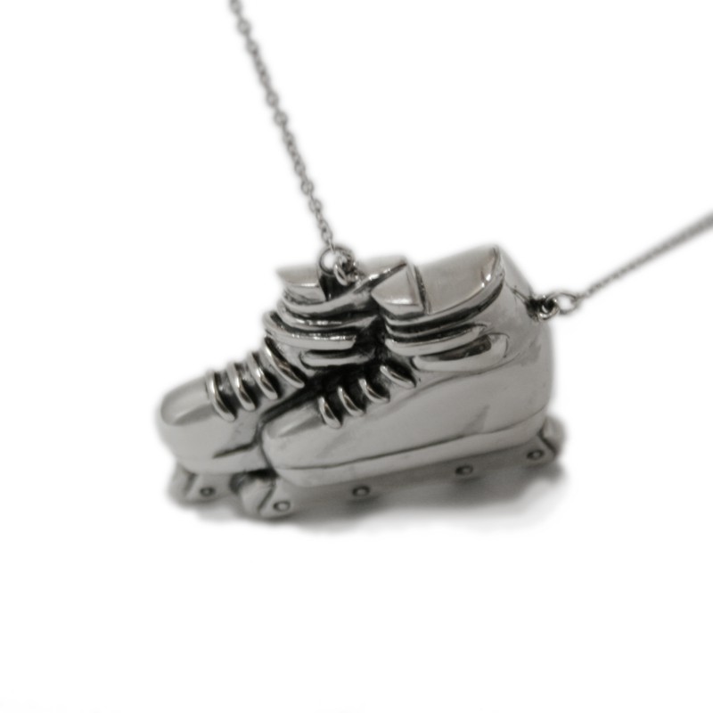 Colgante personalizado de plata de ley para una fan del patinage. Relieve modelado en forma de patines con acabado pulido y recovecos oscurecidos. Interior hueco no a la vista. Anverso pulido.
