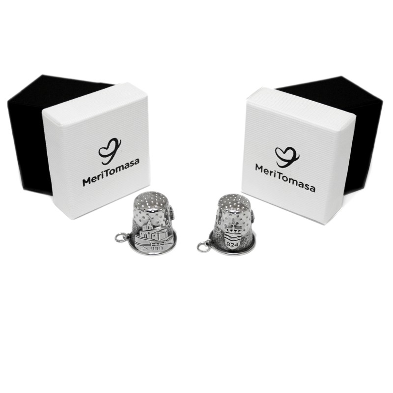 Dos dedales personalizados en plata de ley. Regalo de Marta y familia para M.A., su abuela de 85 años, que tiene una larga colección de dedales pero le faltan los de Salcedillo, su pueblo natal, y Brañosera, donde vivió su niñez y juventud. El encargo: crear esos 2 dedales a medida con los signos de cada pueblo y personalizados: