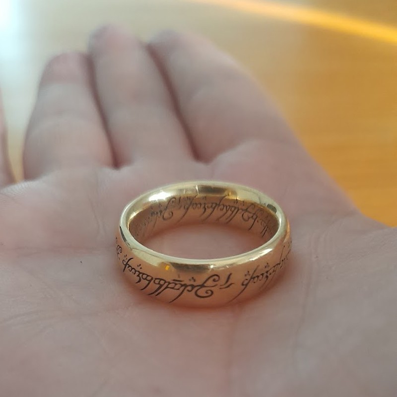 Solo puedo decir que es perfecto. Le pedí a Meri que mi Anillo Único cumpliera unas condiciones muy precisas, y ella siempre ha superado mis expectativas. Me ha acompañado en todo el proceso de diseño y fabricación del Anillo, y el resultado es arrebatador. Solo su brillo y su peso en la mano ya impresiona, pero ver además la inscripción, tan clara, tan fina y oscurecida en rutenio me resulta hipnótico.