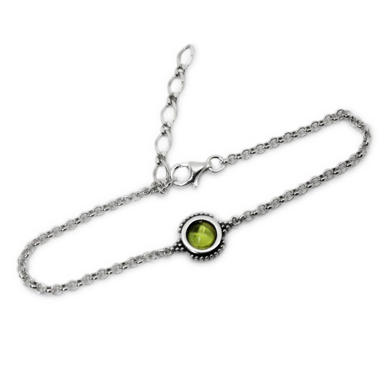 Pulsera personalizada en plata de ley y con un peridoto. Regalo de Emma para su hermana. Cadena de plata de ley acabada en eslabones más grandes para hacerla ajustable. En el centro, un peridoto.